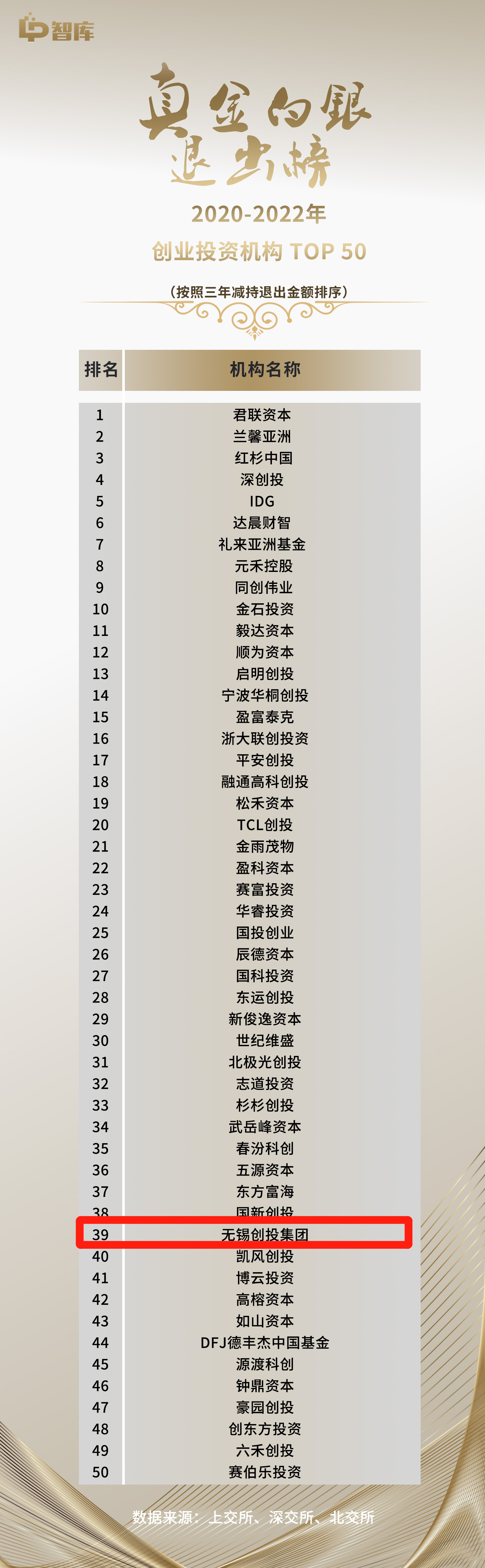 創(chuàng)投集團榮獲《真金白銀退出榜》2020-2022年創(chuàng)業(yè)投資機構(gòu)TOP50榜第39名