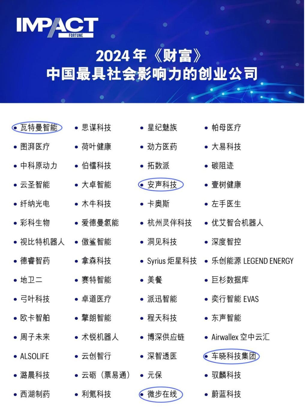 近日,全球著名商業(yè)雜志《財富》(Fortune Magazine)發(fā)布“2024年中國最具社會影響力的創(chuàng)業(yè)公司”榜單。創(chuàng)投集團(tuán)4家被投企業(yè)成功上榜,包括:瓦特曼智能、安聲科技、微步在線和車曉科技。
